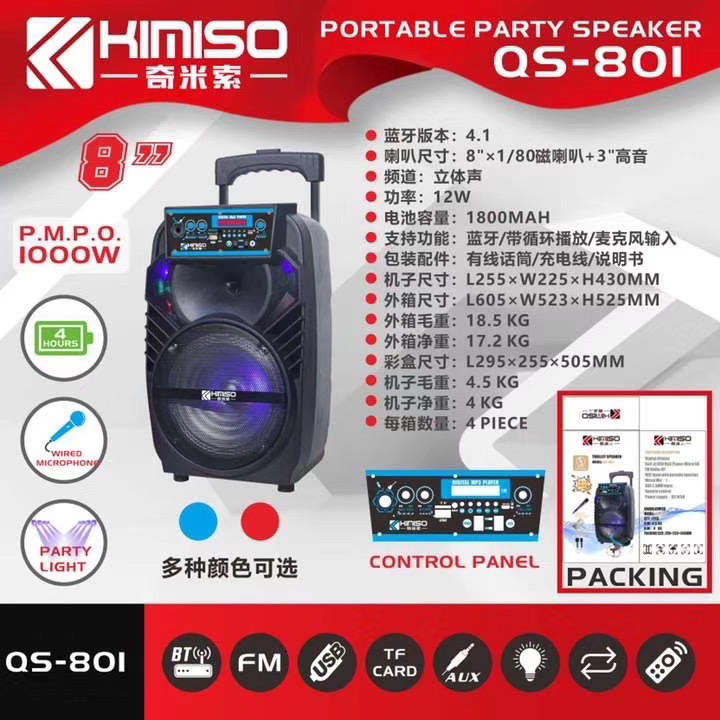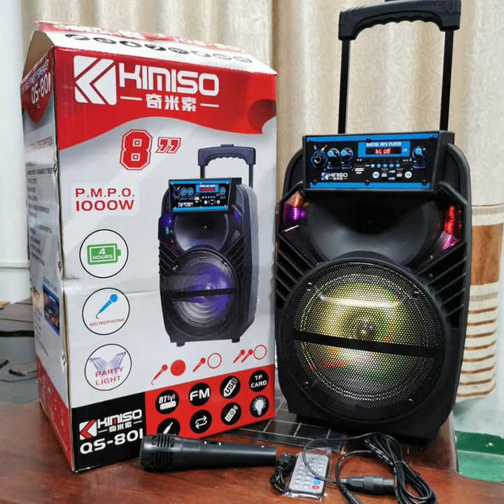 Altavoz Portátil con Ruedas KIMISO QS-801 de 8 Pulgadas, Sistema de Altavoces para DJ, Caja de Sonido con Subwoofer, Luz LED, Altavoz Bluetooth