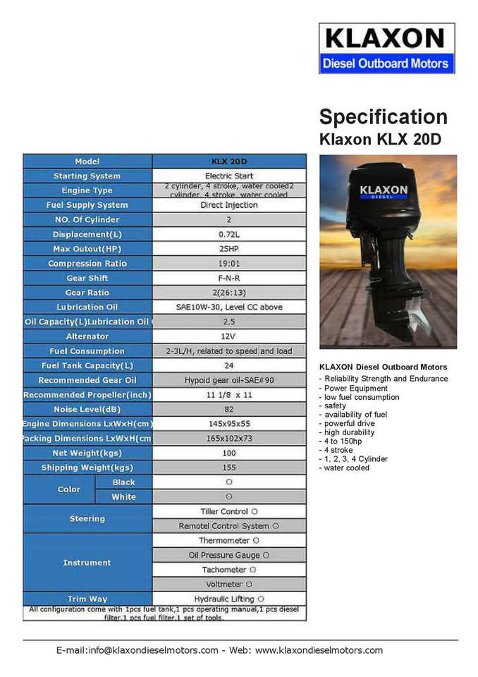 Motor Fuera de Borda Diésel KLAXON de 20 HP y 2 Cilindros, Modelo KLX 20D, Garantía de 12 Meses, Nuevo