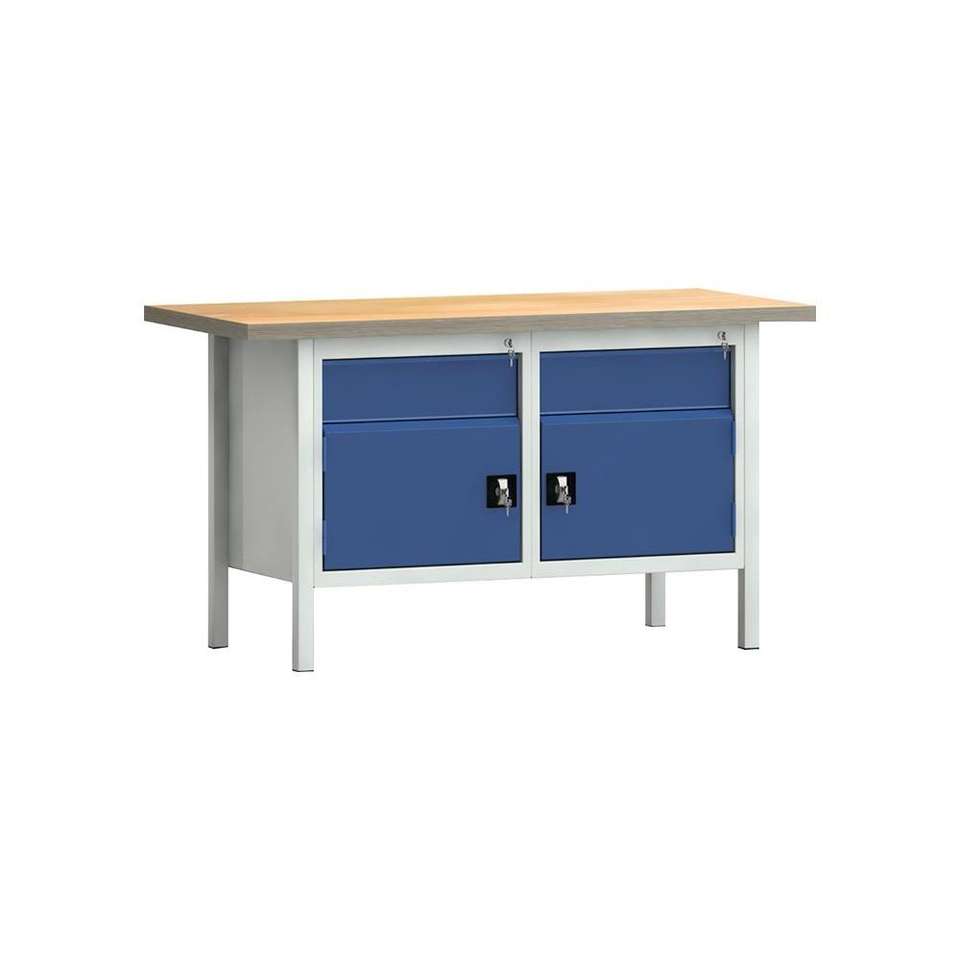 KLW LUTZ Banco de Trabajo PW 700 W1500xD700xH840mm haya multiplex gris claro, RAL 7035 Azul genciana, RAL 5010 2 dibujo., 2 puertas