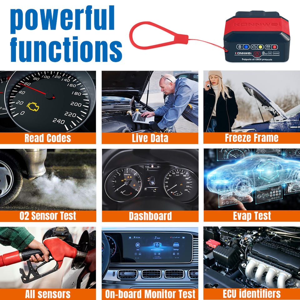Combinación:read and clear fault codes, read live sensor data, graph live data, turn off the MIL, vehicle information, EVAP system vapor pressure, throttle position/mass air flow, fuel pressure/trim/level/consumption, intake manifold pressure/barometric pressure