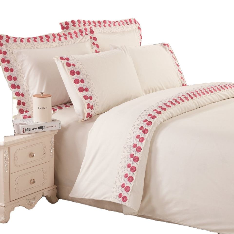 Juego de Sábanas Planas KOSMOS de Microfibra 100% Poliéster, Tamaño Personalizado, Borde de Encaje Bordado Rojo, 4 Piezas