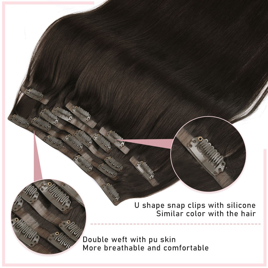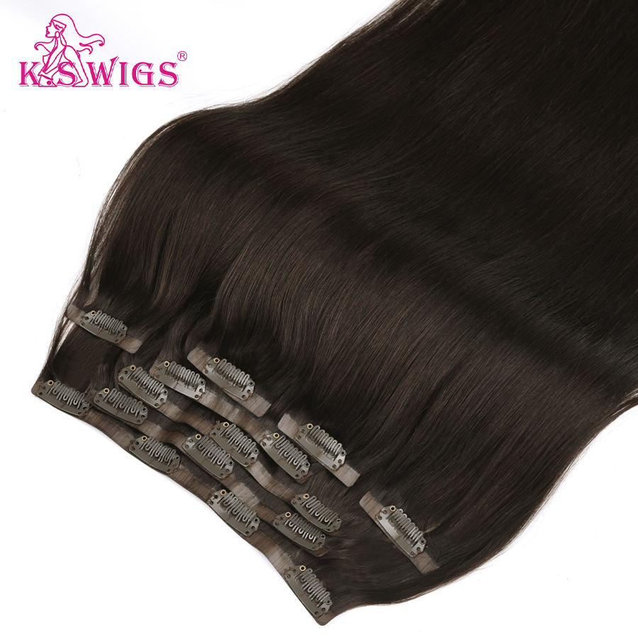 Extensiones de Cabello Remy Peruano con Clip KSWIGS de 16 Pulgadas para Mujer, 7 Piezas/Juego, Negro Natural, Castaño, Doble Trama a Máquina