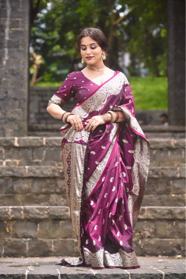 Sari de Seda Suave Banarasi en Color Vino | Tela de Zari Plateada para Vestidos de Novia, Elegante Zari Plateado para Festivales y Eventos Tradicionales