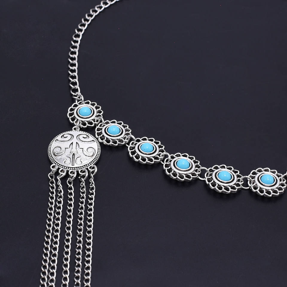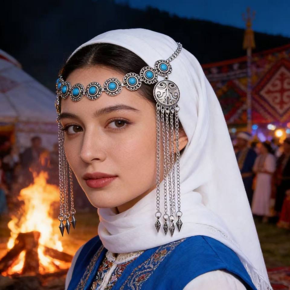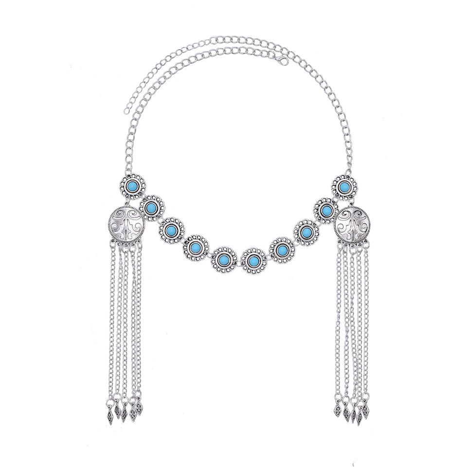 Cadena para la frente estilo étnico con microturquesa de imitación kazaja, borla de plata antigua, accesorio para el cabello, Xinjiang Kashgar Travel