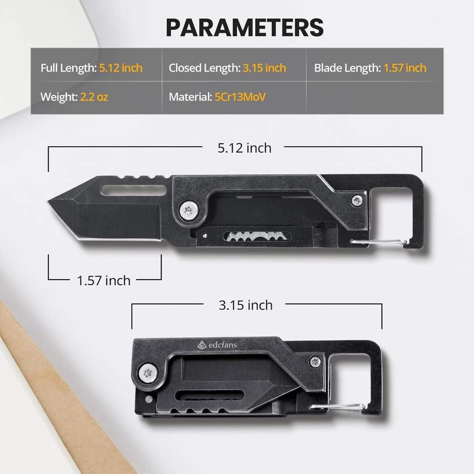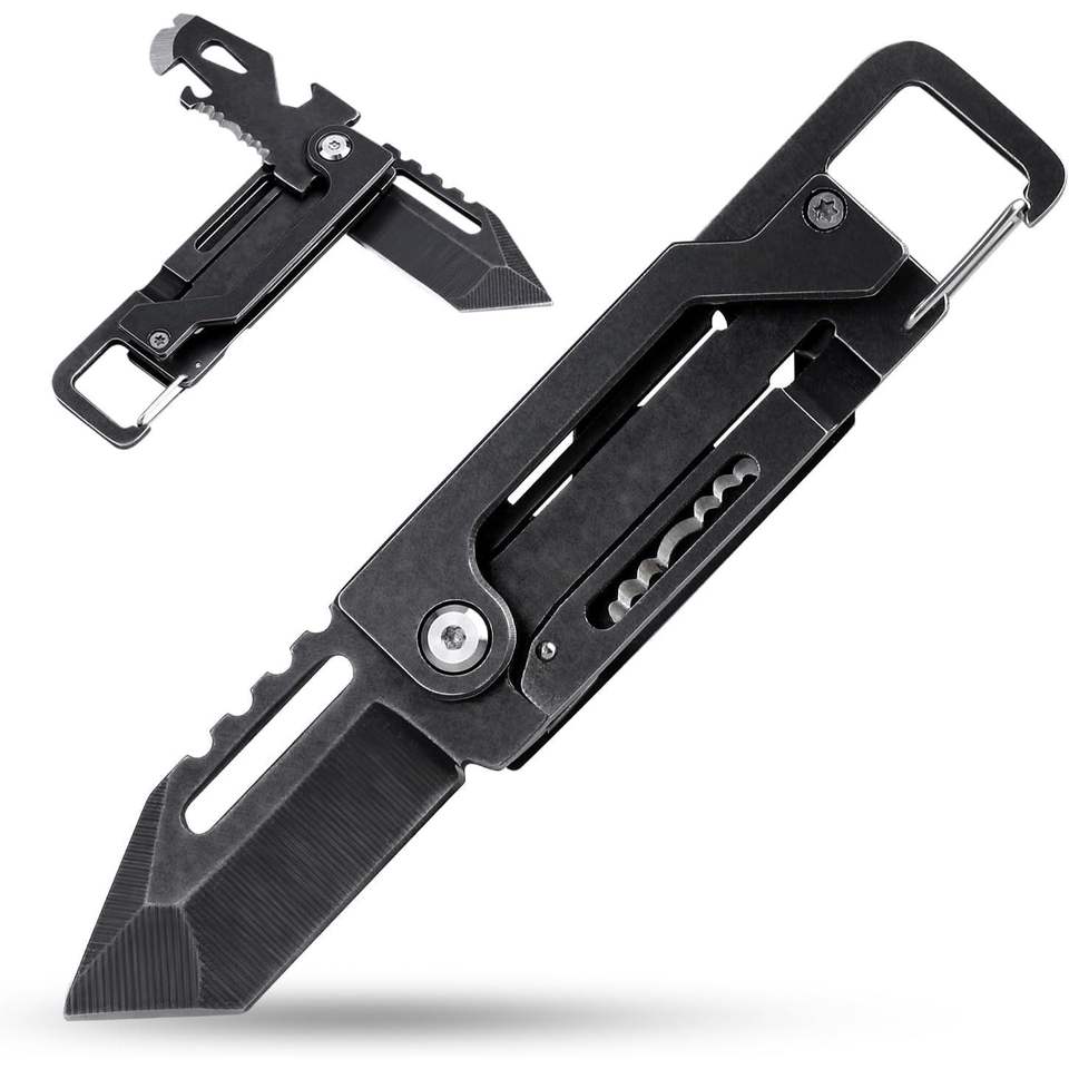 Llavero Multiherramienta con Navaja Tanto, Cortador de Cajas, Abrebotellas, Destornillador, Llave Inglesa, Herramienta de Apertura, Mosquetón y Clip para Llaves