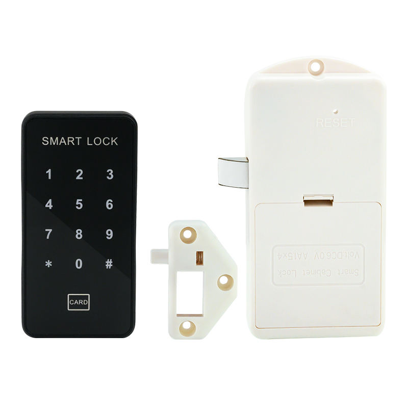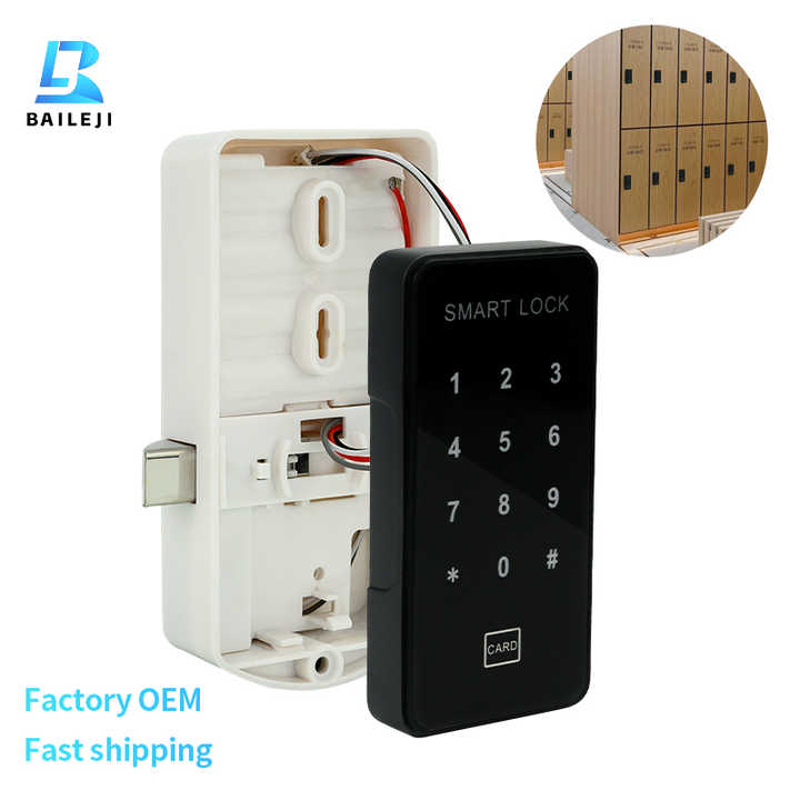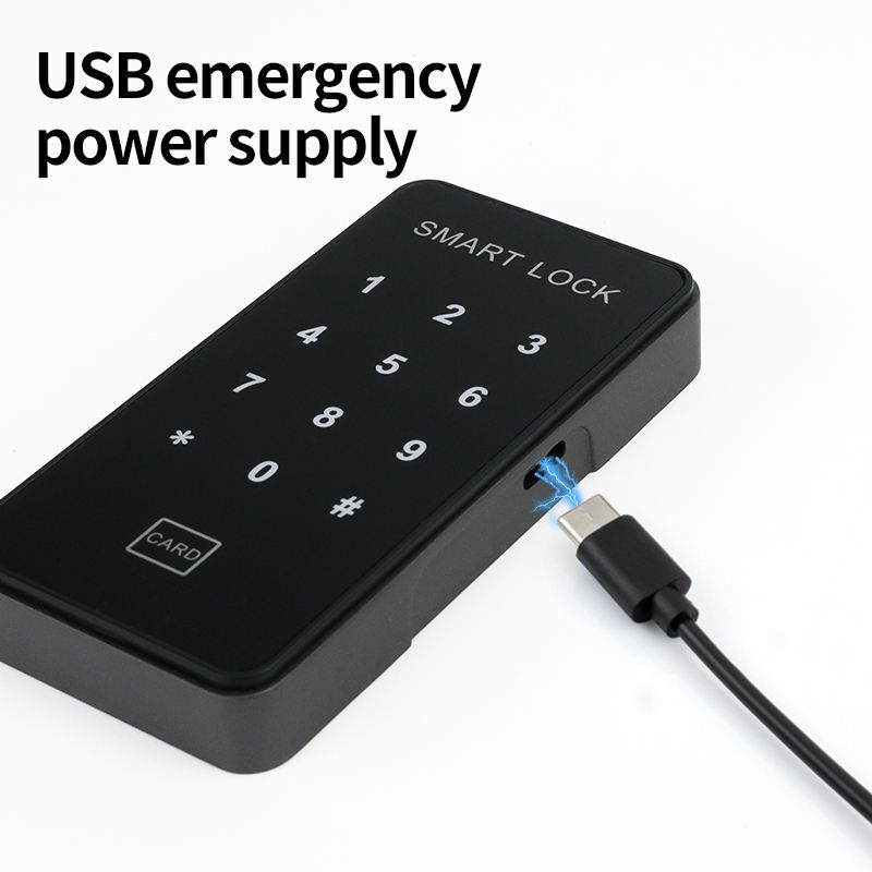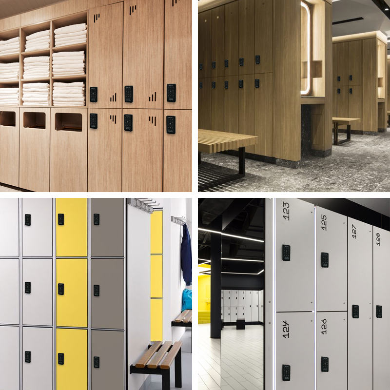 Cerradura electrónica negra con combinación digital y lector de tarjeta para taquillas de gimnasio