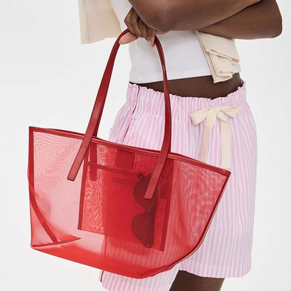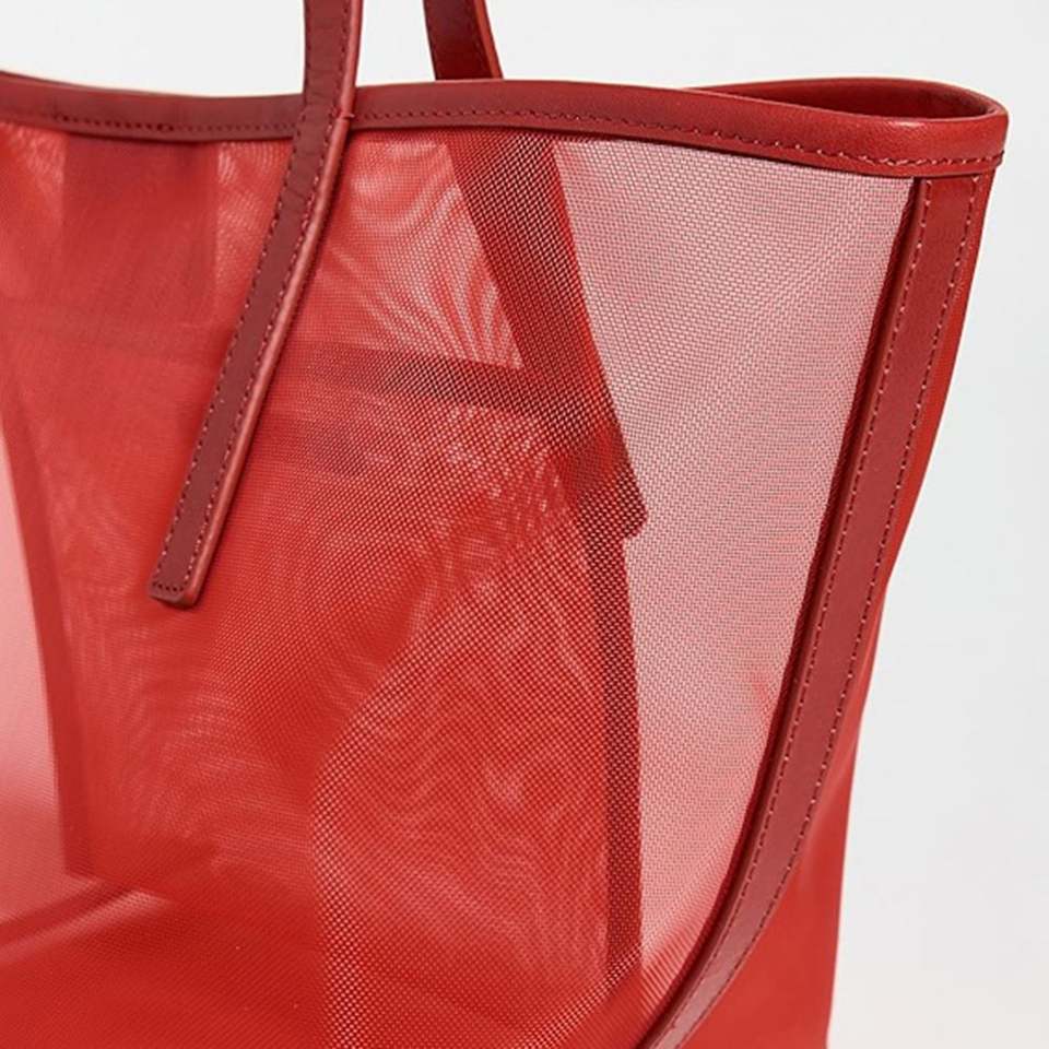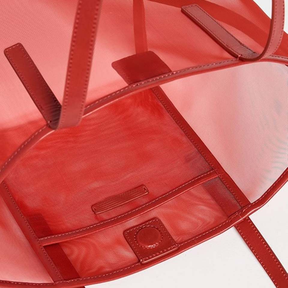 Bolso Tote de Malla Roja Reutilizable Personalizado Keymay para Mujer, Bolso de Playa de Hombro Único Portátil para Viajes de Verano con Cierre Magnético de Cuero