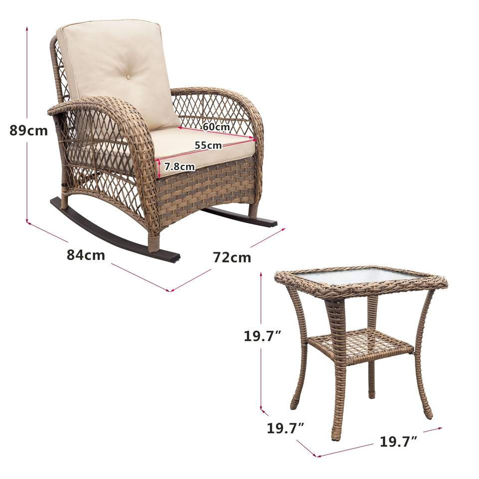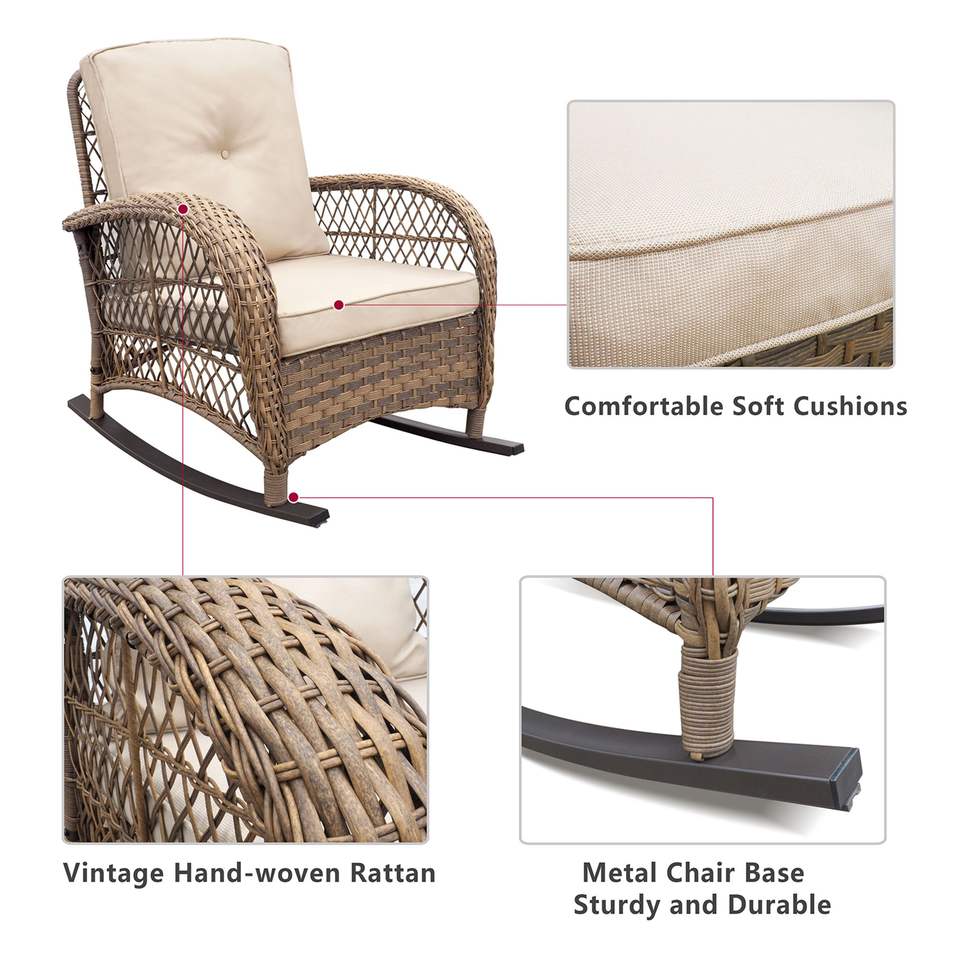 Juego de 3 Sillas Mecedoras de Mimbre para Patio Exterior Color Caqui con Cojines Impermeables para Uso en Jardín