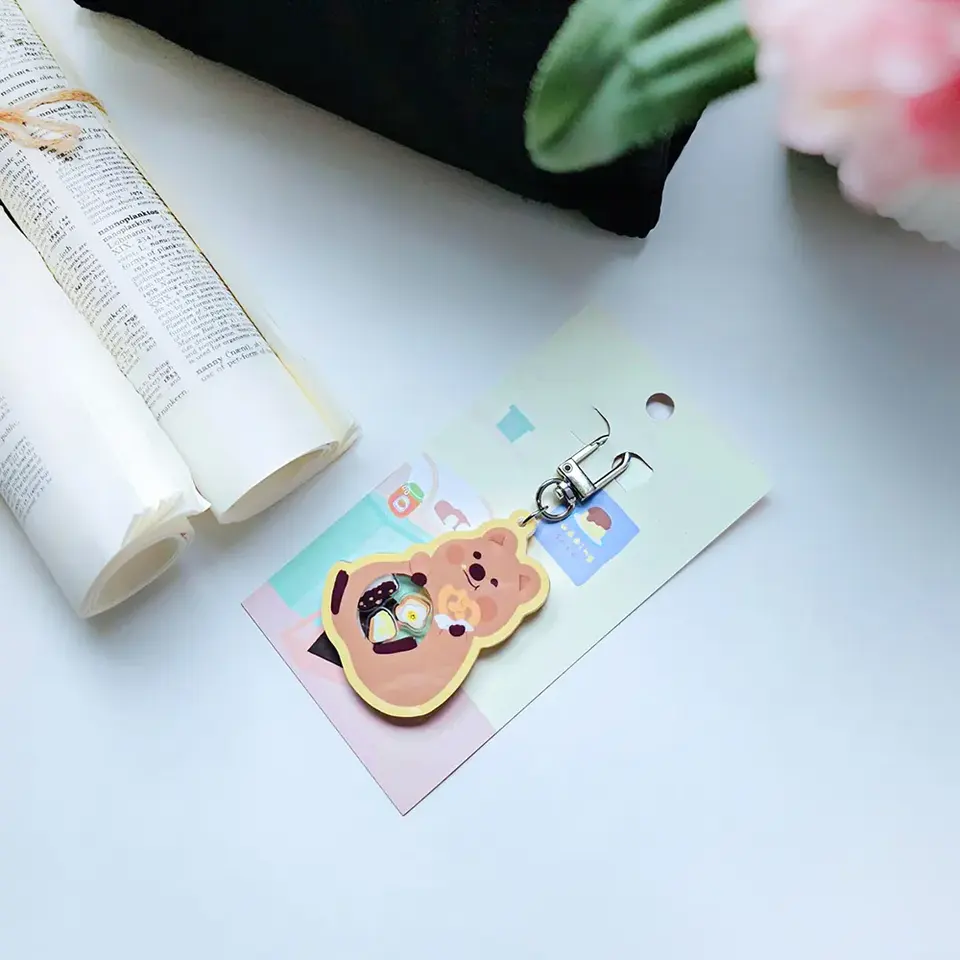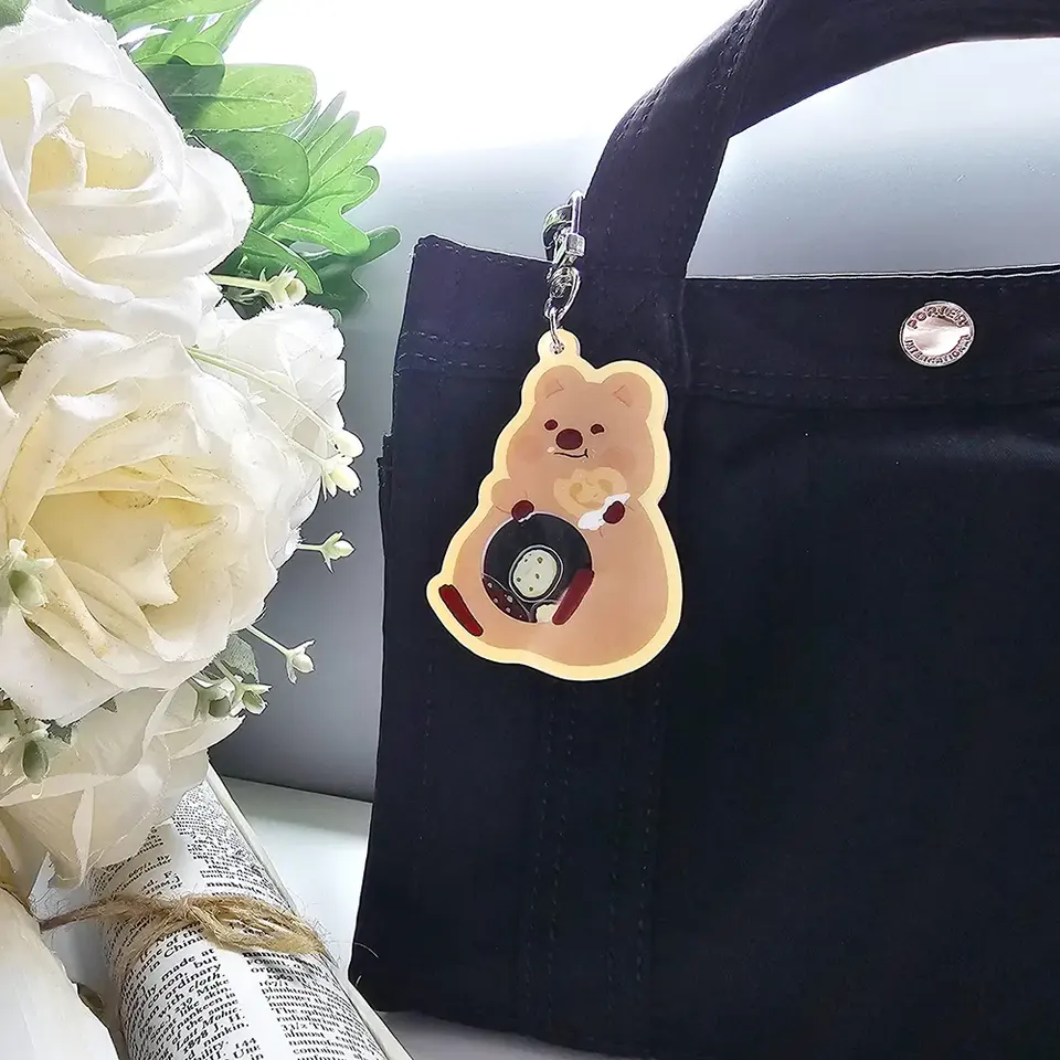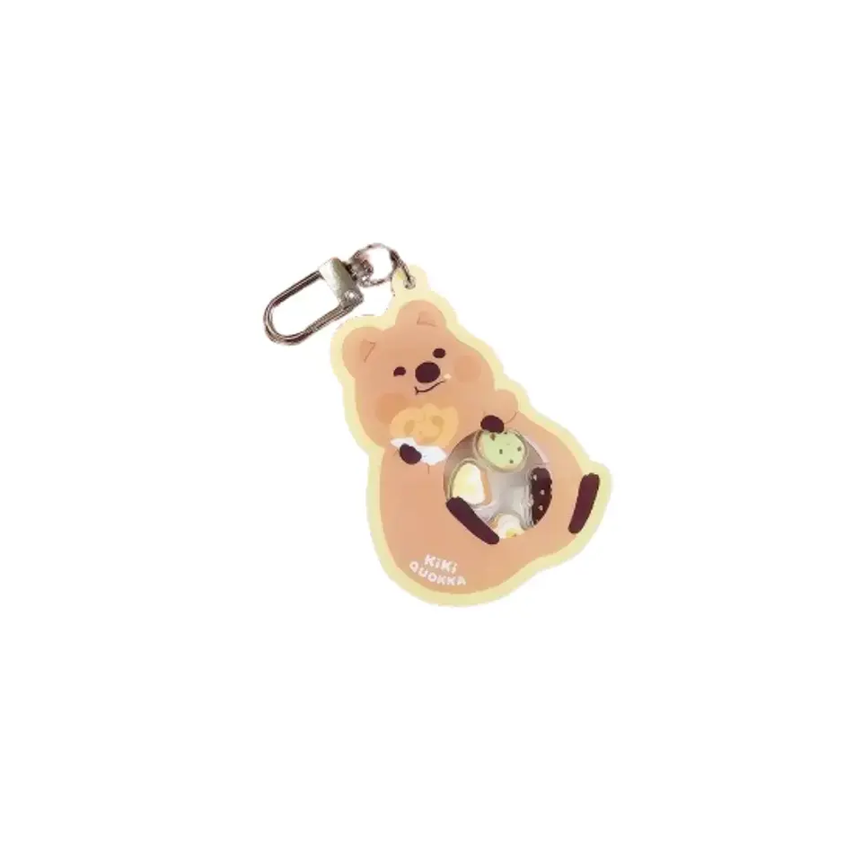 KiKi QUOKKA estilo de dibujos animados marrón acrílico Shaker Swinging llavero impermeable con encanto juguetón y diseño de impresión Digital