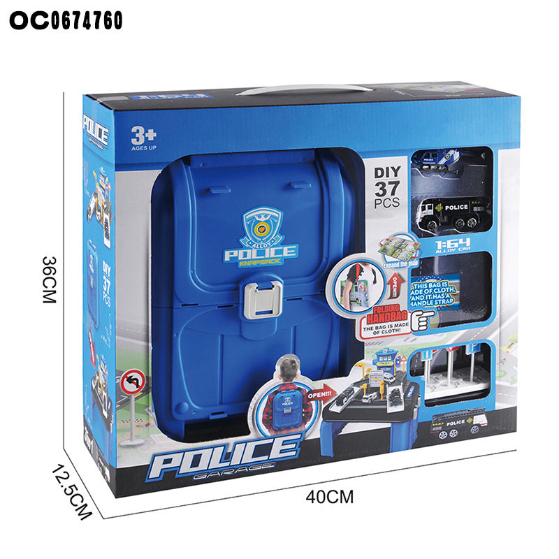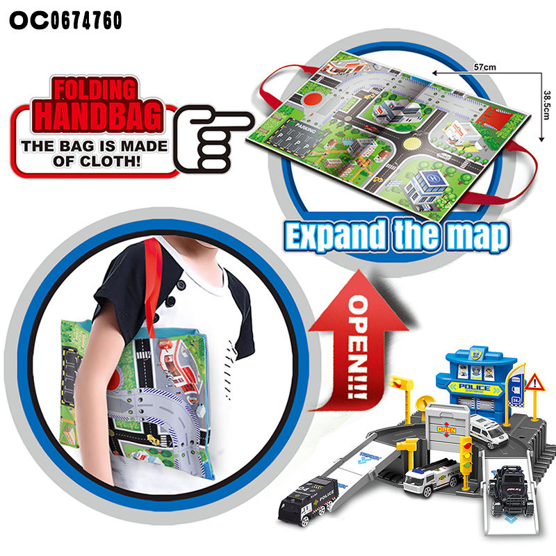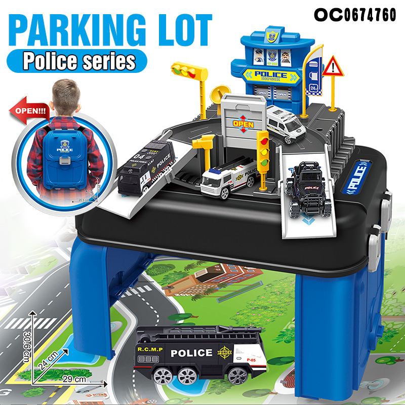 Kids backpack 3d model police alloy cars parking lot set toys with map