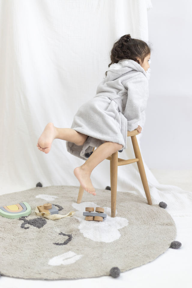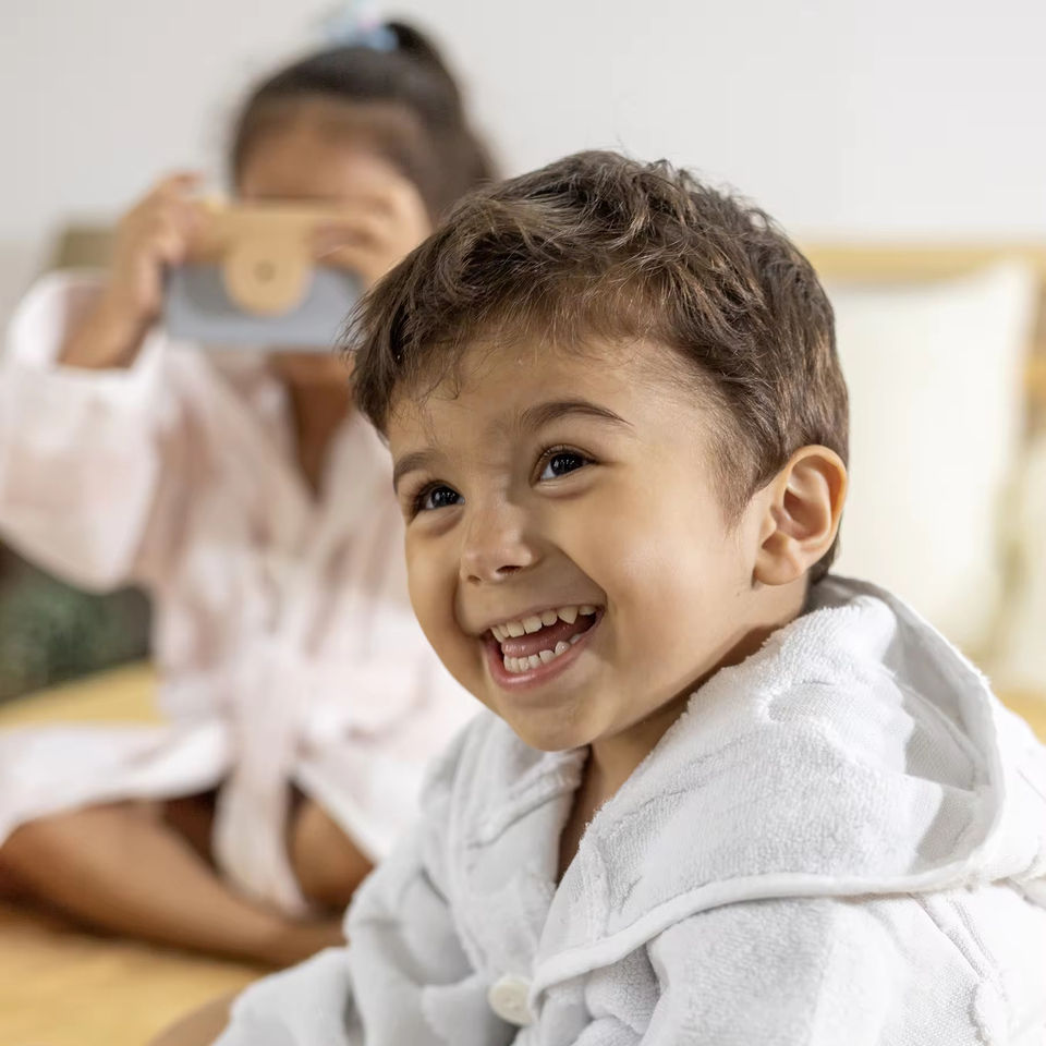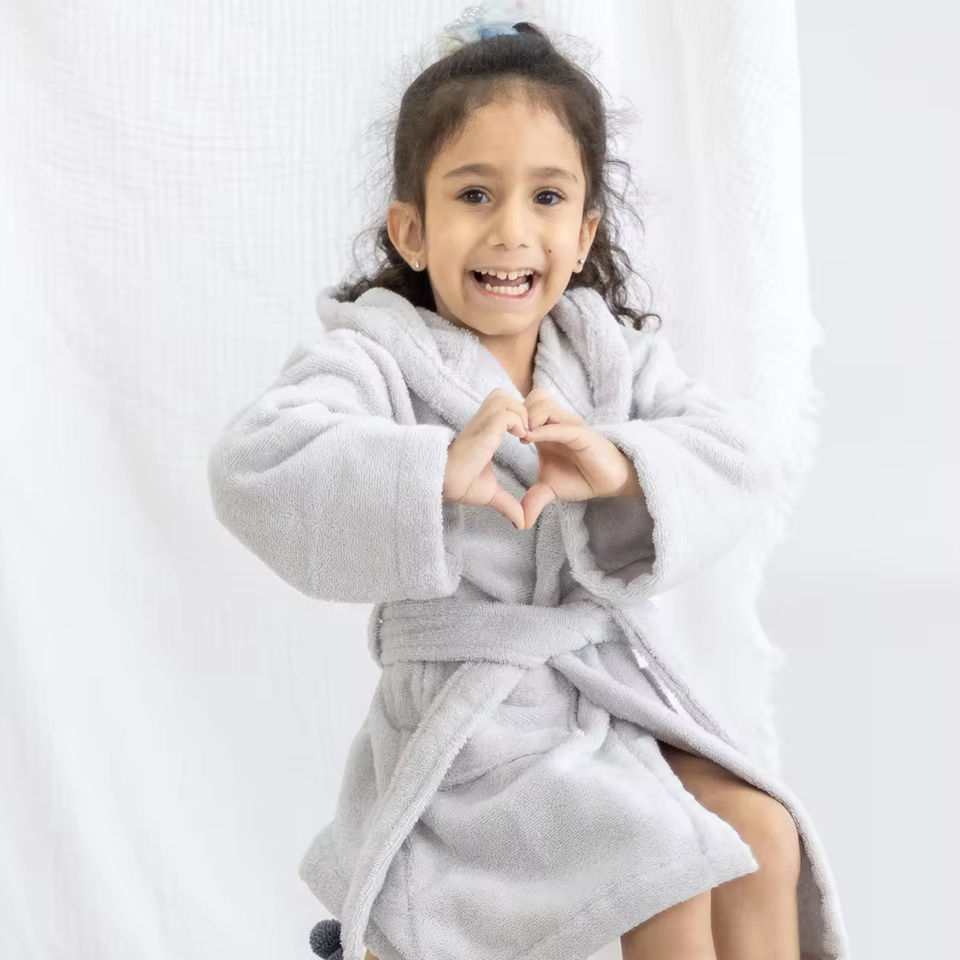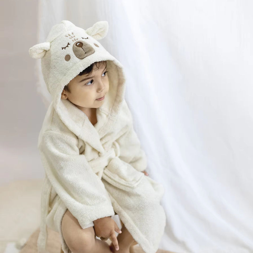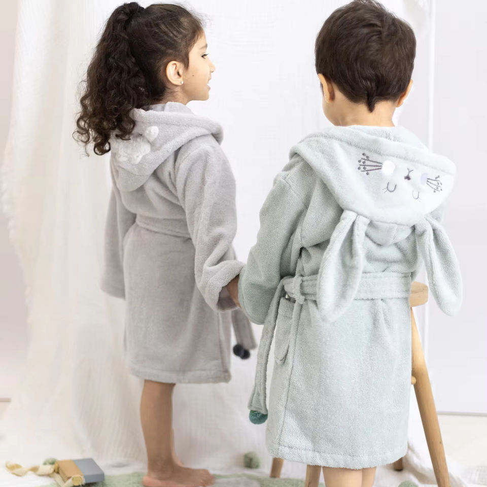 Bata de Baño Infantil de Lujo con Capucha, 100% Algodón Orgánico Peinado, Secado Rápido, Tejido Comprimido, Certificado BSI, Diseño Damasco Cuadrado/Rectangular, MS