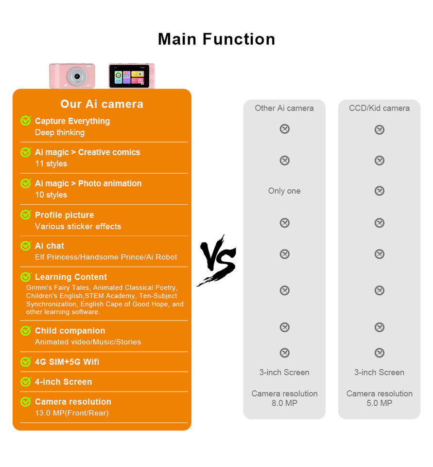 Mini Cámara Inteligente con IA para Niños, Sensor CMOS, Compatible con Tarjetas TF, Pantalla IPS HD de 3.97 Pulgadas con Protección Ocular, Zoom Óptico de 10x-20x, Proyección MP3