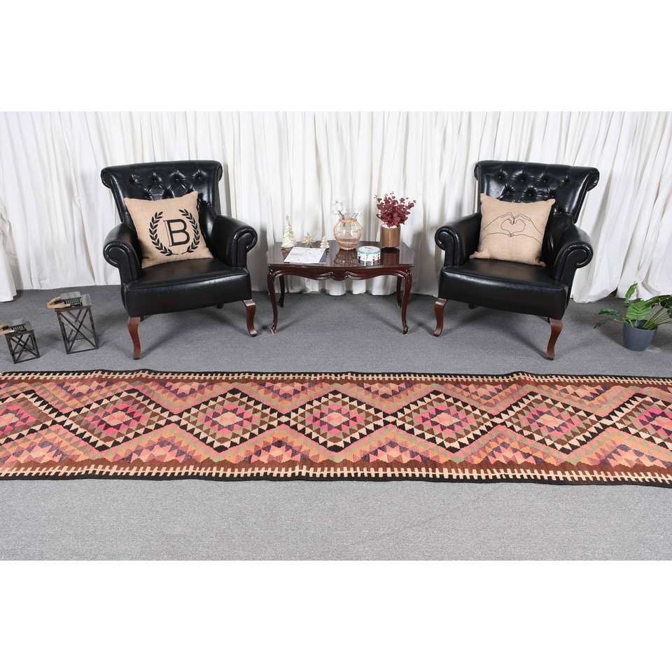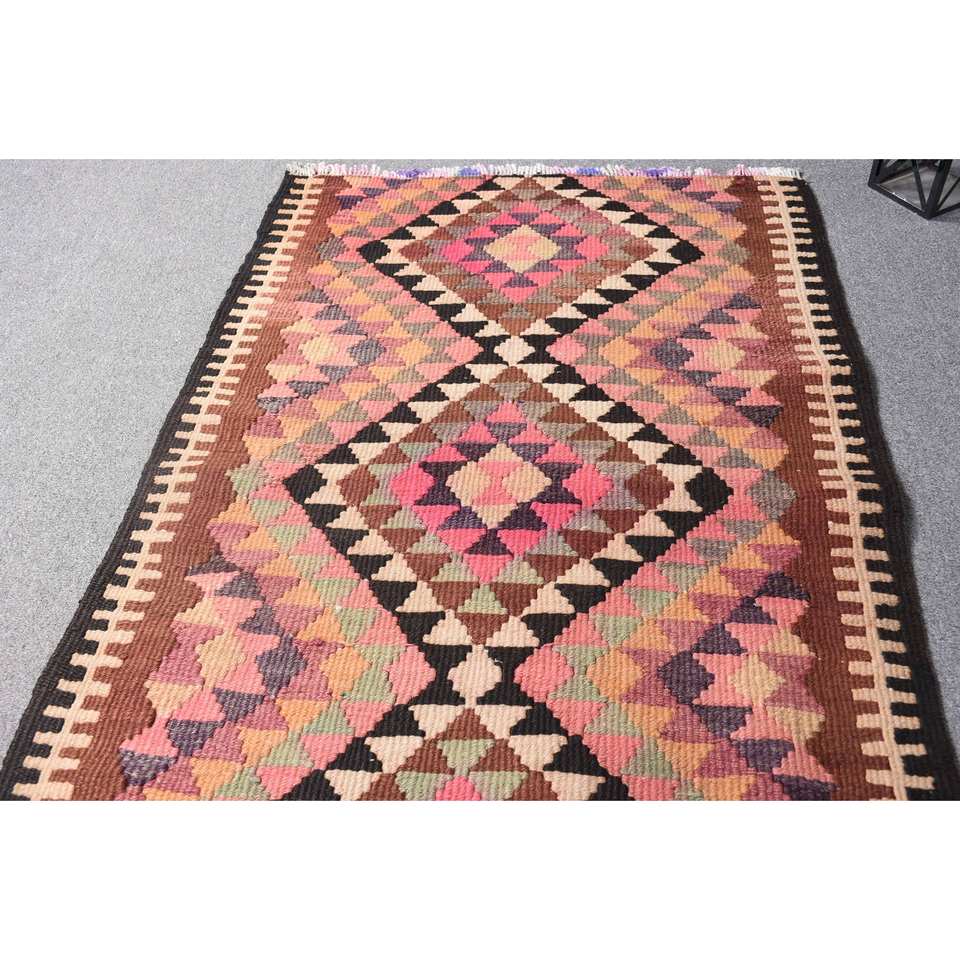 Kilim, alfombra de lana rosa marrón, 3x11,7 pies, tejido plano turco hecho a mano, Jacquard, patrón abstracto, látex para pasillo, espacio rectangular