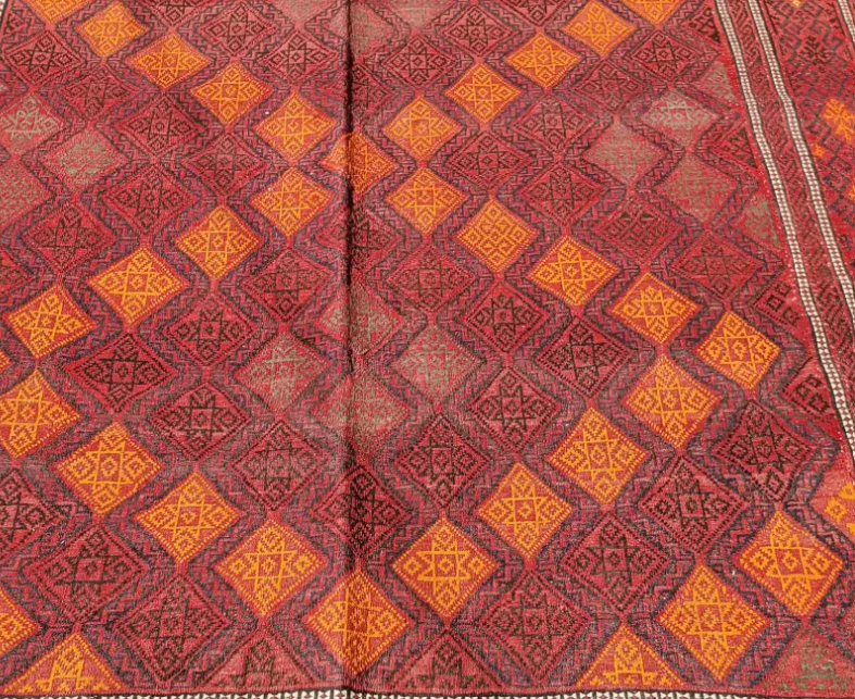 Alfombra Kilim Tejida a Mano, Color Rojo Intenso y Dorado, Diseño Geométrico de Diamantes, Tejido Plano de Lana