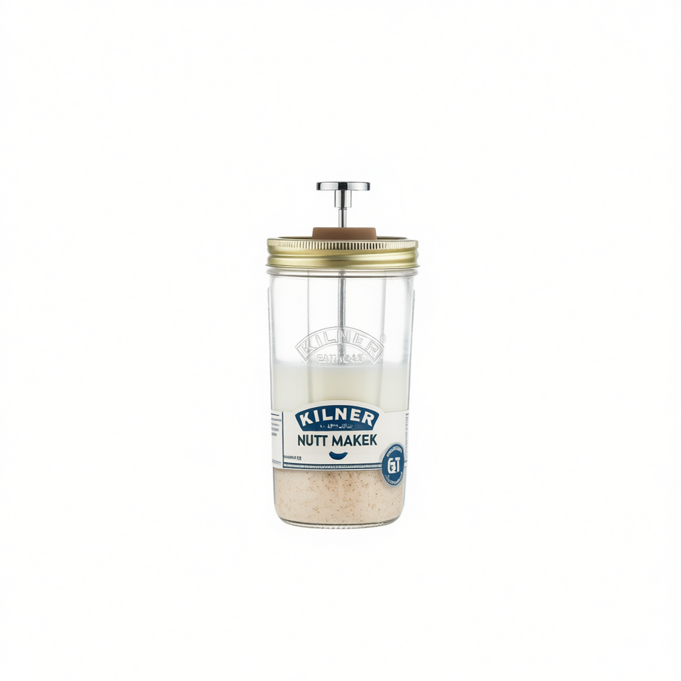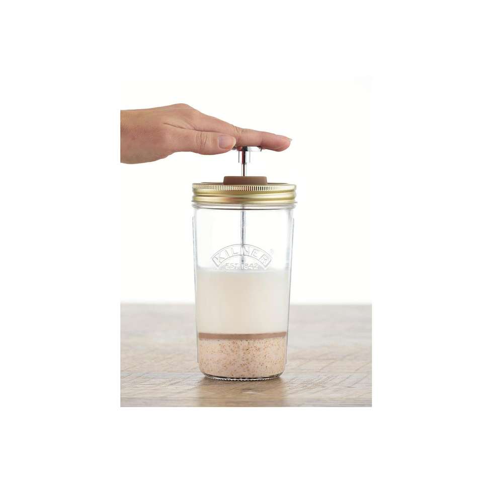 Jarra para hacer leche de frutos secos Kilner con filtro, pistón y tapa para la elaboración casera de leche de frutos secos
