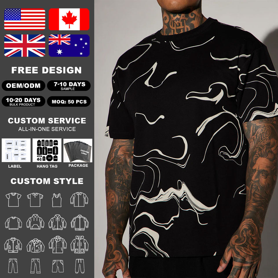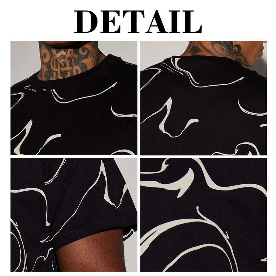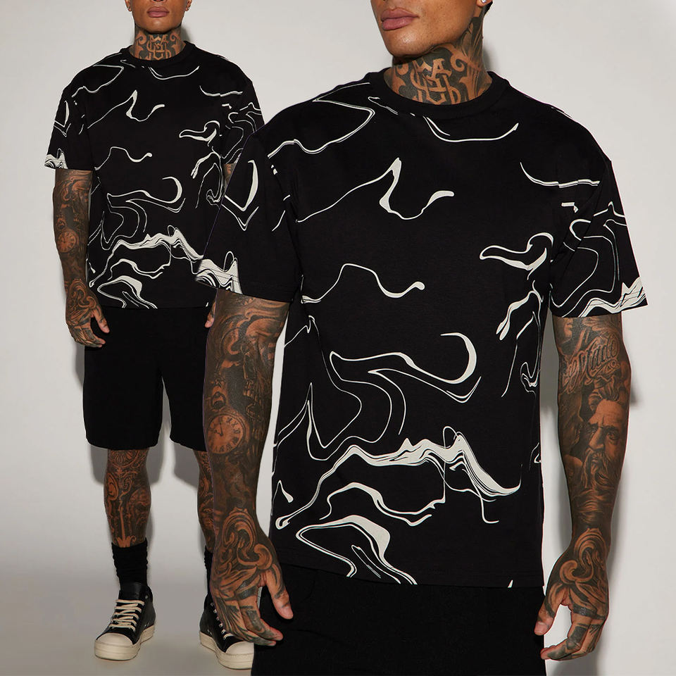 Camiseta KingSen para Hombre, Oversize, con Estampado Abstracto de Líneas Fluidas, Algodón Grueso, Estilo Hip Hop Urbano, Corte Holgado, Informal, con Diseño Gráfico