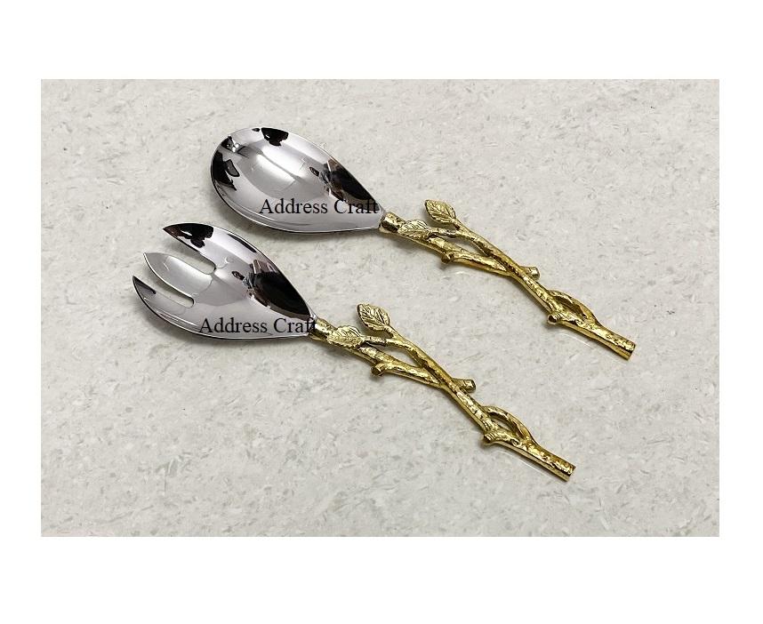 Accesorios de cocina, diseño de Rama, juego de servidor de ensalada con mango de latón, cuchara, tenedor, herramienta para servir, cubiertos, vajilla de Metal