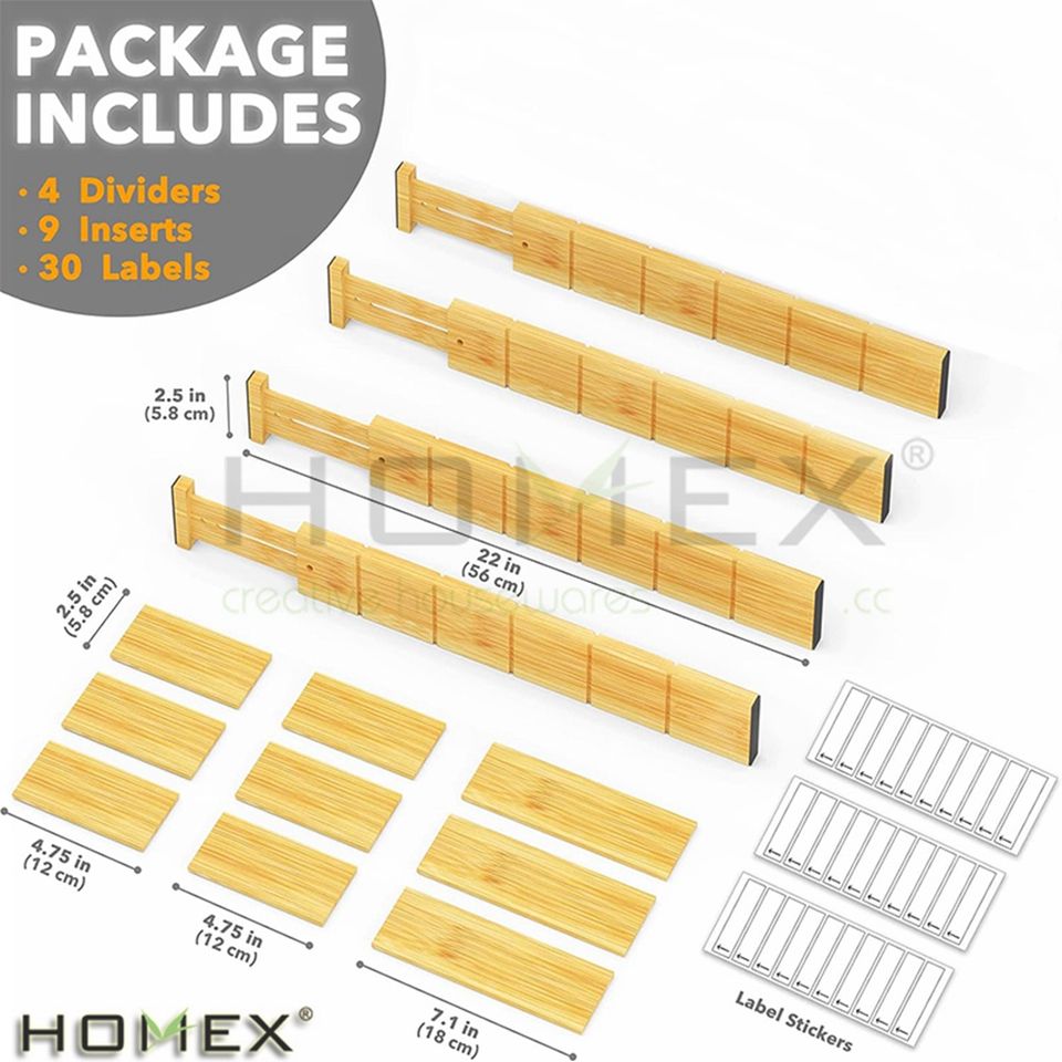 Organizadores de Cajones Ajustables para Cocina, Divisores de Cajones de Bambú, 4 Divisores con Insertos y Etiquetas