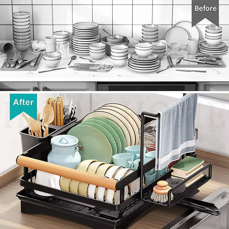 Escurridor de Platos Metálico para Cocina, de Gran Capacidad, con Porta Cubiertos, Color Negro