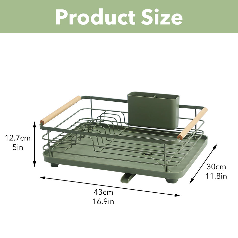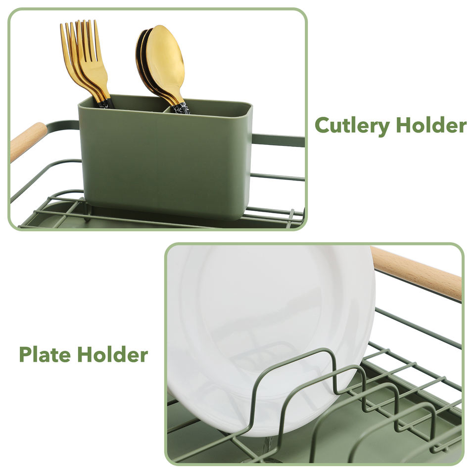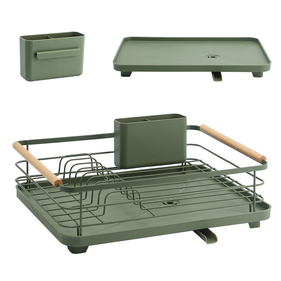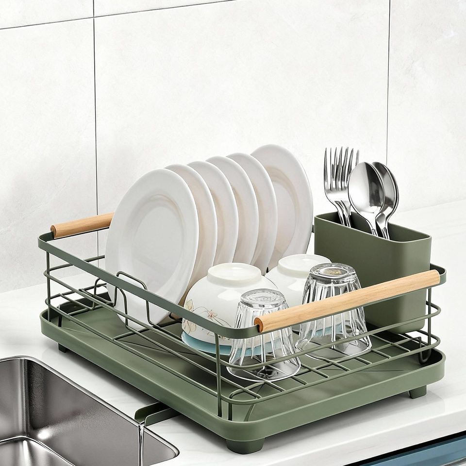Escurridor de Platos para Encimera de Cocina, Organizador de Fregadero de Metal con Porta Utensilios, Decoración para el Hogar y Apartamento, Tubo de Drenaje, Mango de Madera