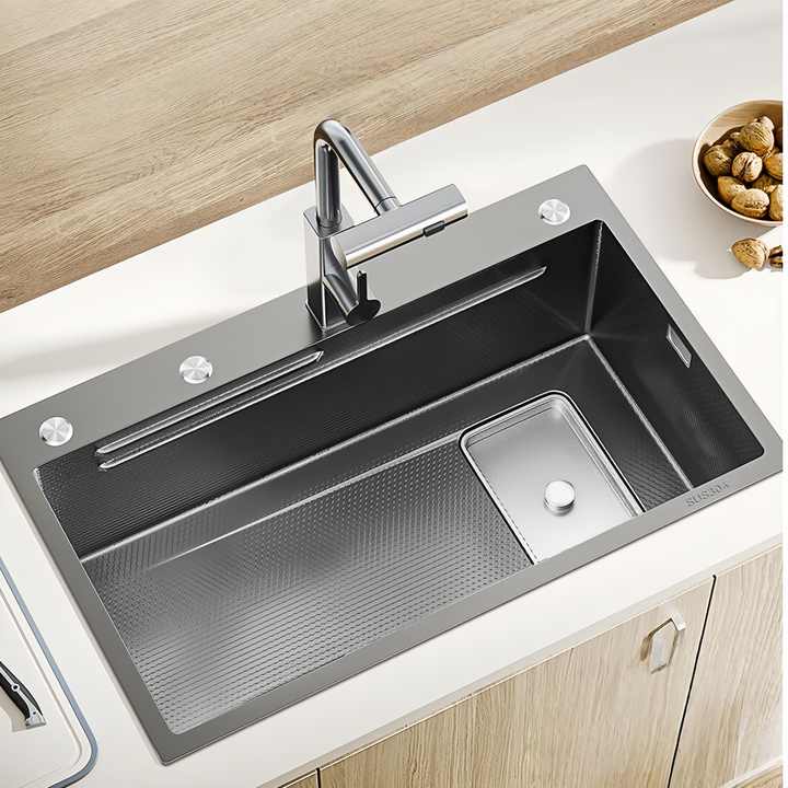 Fregadero de cocina grande de un solo tazón con lavabo integrado de acero inoxidable 304, multifuncional, con relieve de grano de arroz