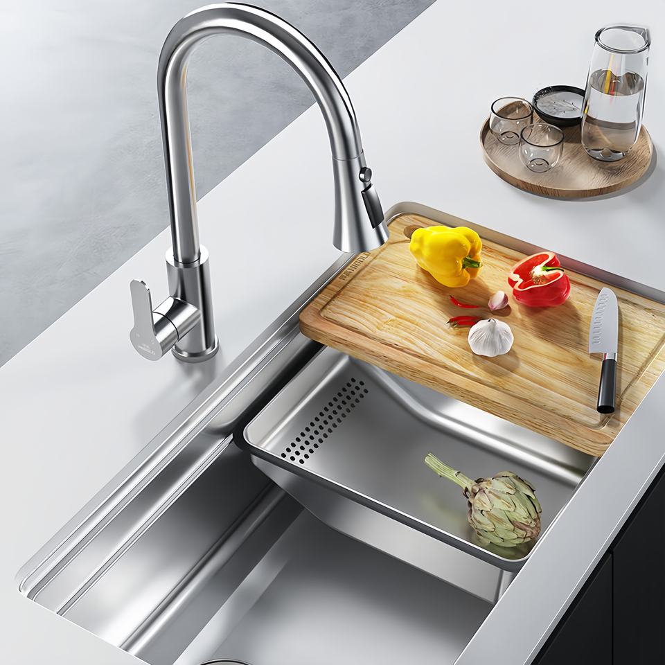 Fregadero de cocina grande de un solo seno para lavar verduras, de doble nivel, de acero inoxidable 304, para montaje superior/bajo encimera