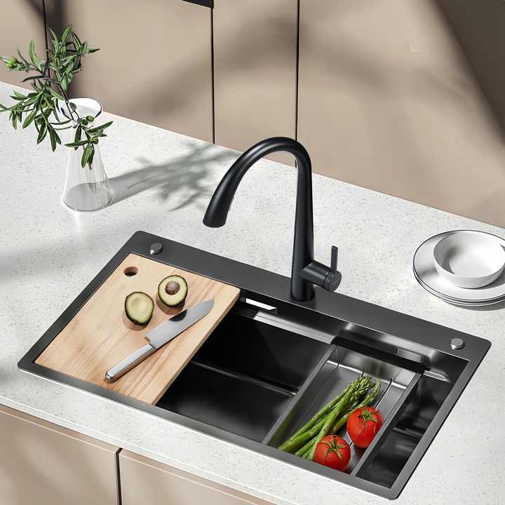 Fregadero de Cocina Nano Track Grande de un Solo Tazón de Acero Inoxidable con Lavado, Corte y Drenaje Integrados