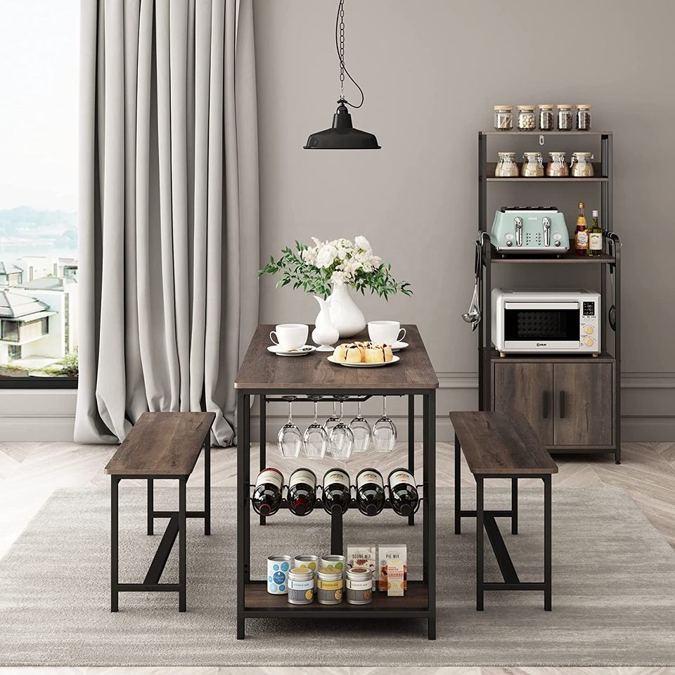 Mesa de Cocina y Banco para 4 Personas, Juego de Mesa de Comedor de Madera Rústica, Mesa de Desayuno con Ganchos, Botellero y Portavasos