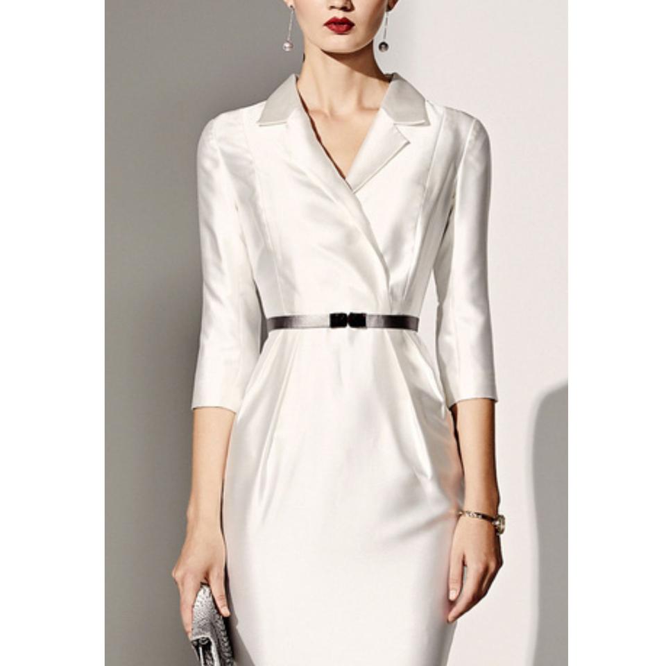 Vestidos hasta la rodilla Vietnam Natural Formal Liso Teñido Oem Servicio Cuello en V Tela de sarga Antiarrugas Oficina Vestidos de manga larga