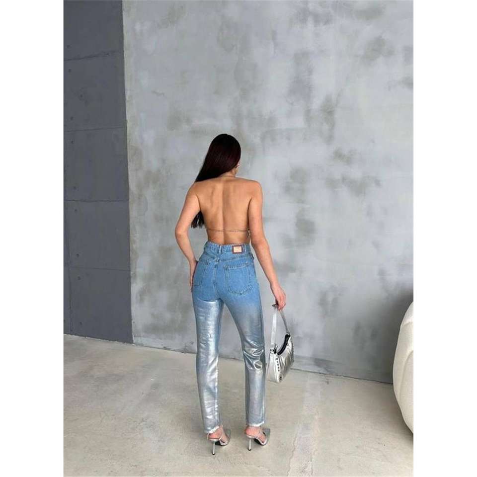 Jeans de mezclilla para mamá con detalles de lámina y roturas en la rodilla, transpirables, plateados, tipo lápiz, con decoración de botones en la cintura, talla XL, de algodón, con estampado de color oscuro