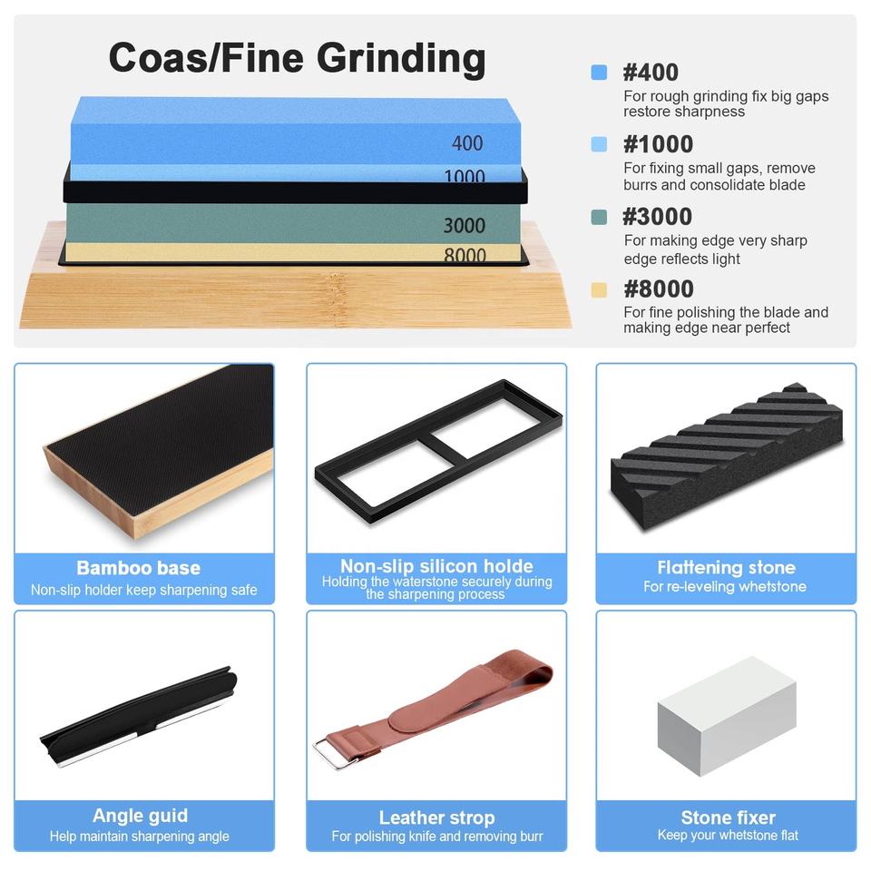 Afilador de Cuchillos, Piedra de Afilar, Juego de Piedras de Afilar Húmedas 400/1000 3000/8000, Kit de Afilador de Cuchillos con Base de Bambú y Guía de Ángulo