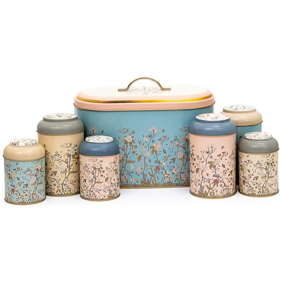 Juego de 7 Recipientes Redondos de Hojalata Kontensan con Tapa de Domo, Diseños Florales y Botánicos en Azul Pastel
