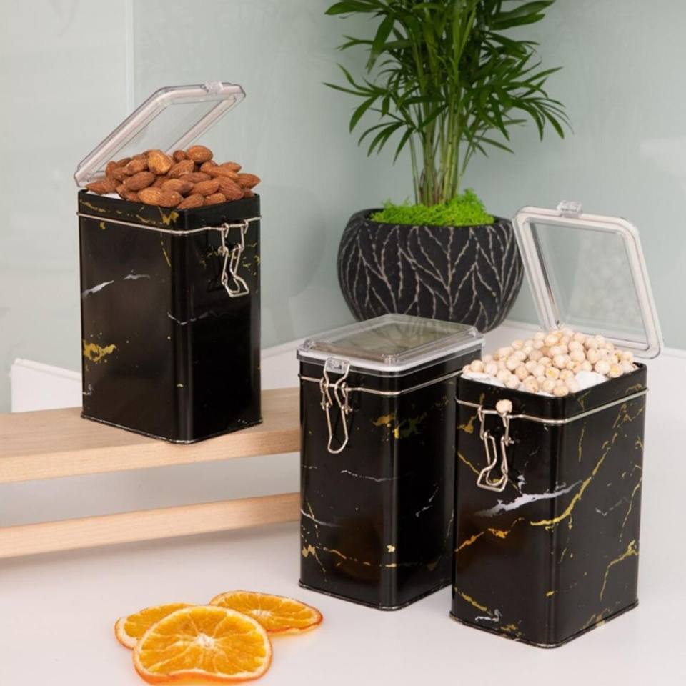Kontensan Juego Caja Metálica Rectangular 75x100x150mm (3 Pzas) Cierre de Alambre y Tapa Transparente Mármol Diseño Negro