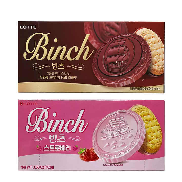 Bocadillos coreanos Lottes Binch Galleta de chocolate Bocadillos exóticos Venta al por mayor Galletas de sándwich de fresa 102G