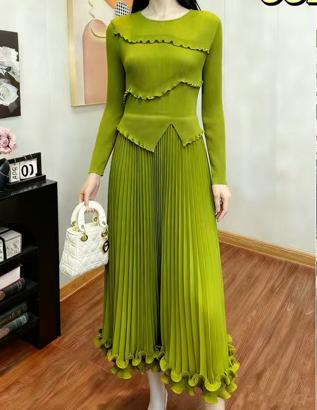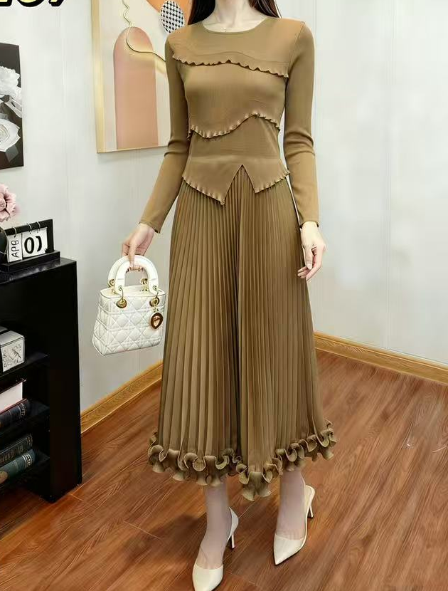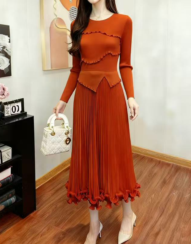 Vestido Largo Elegante de Mujer Estilo Coreano con Volantes, Plisado, Manga Larga, Adornado con Cuentas, Multicolor Opcional, Venta al Por Mayor