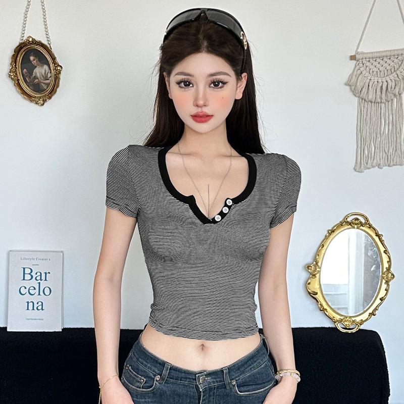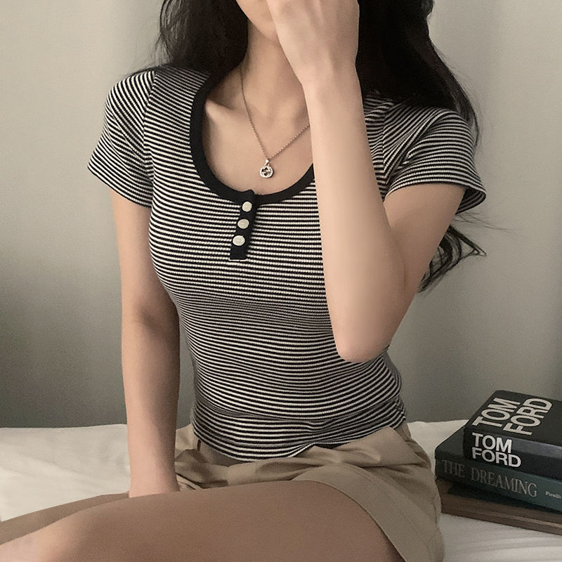 Camiseta Casual de Verano para Mujer, Estilo Coreano, Tejida a Rayas, con Botones al Frente, Corte Ajustado, Manga Corta, Cuello Redondo, Color en Contraste