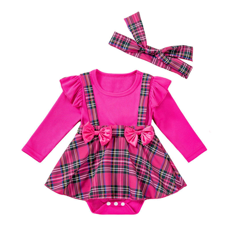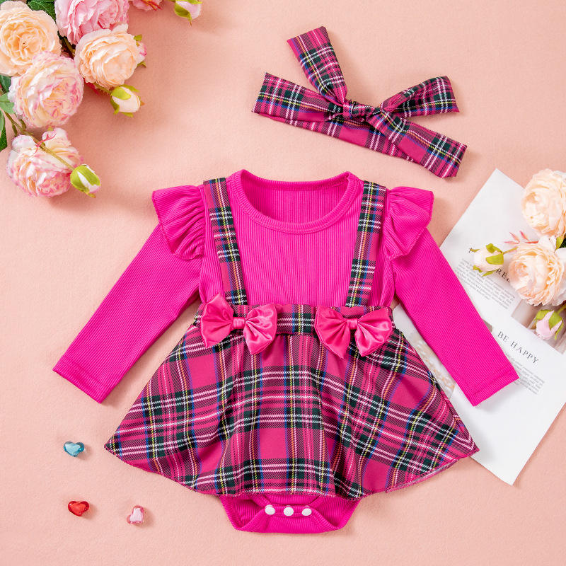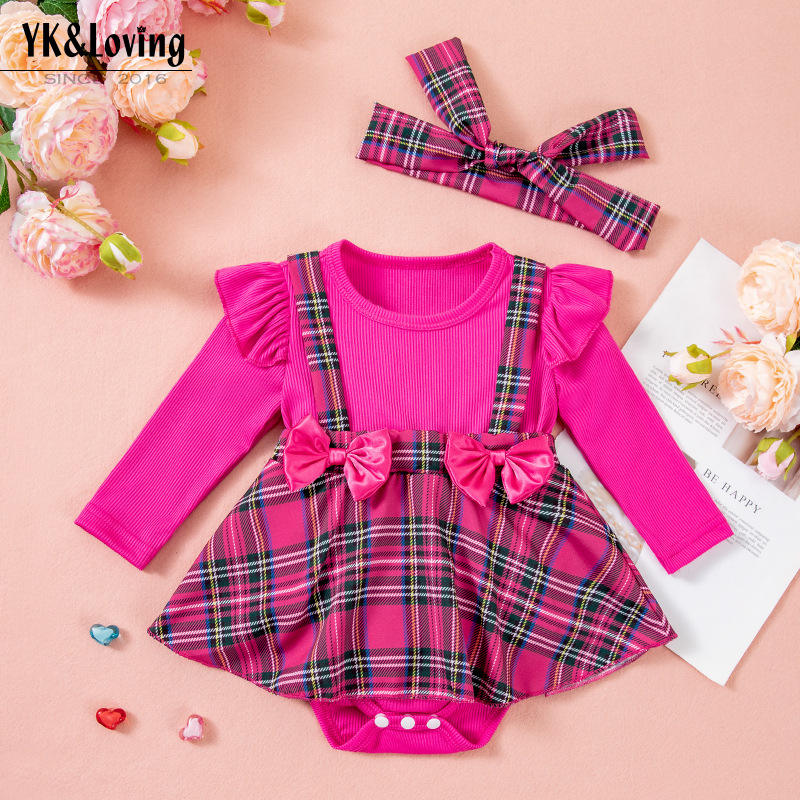 Versión coreana, conjunto de ropa de estilo primavera otoño para bebé femenino, bonito lazo a cuadros, costura, pedo, vestido, Kit de pelo hecho de punto