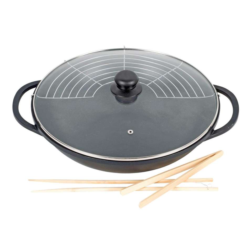 Krüger Wok Leipzig Ø 36cm Aluguss mit Glasdeckel und Zubehör