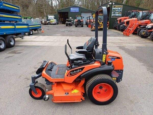 Cortadora de césped Kubota ZD1211 con motor diésel, con recolector, de alto rendimiento y compacta.
