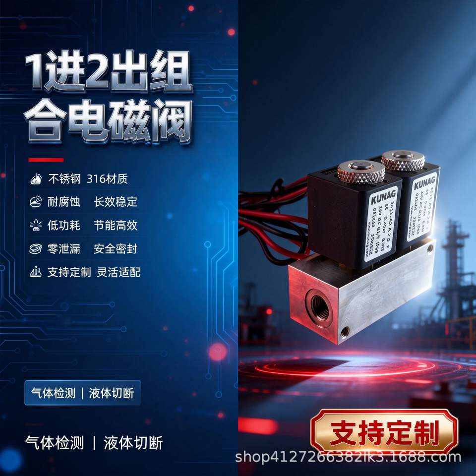 Válvula Solenoide Kunag 1 Entrada 2 Salidas, 1/2 Pulgada, Acero Inoxidable, Control Electromagnético para Medios Gaseosos, Uso en la Industria Química