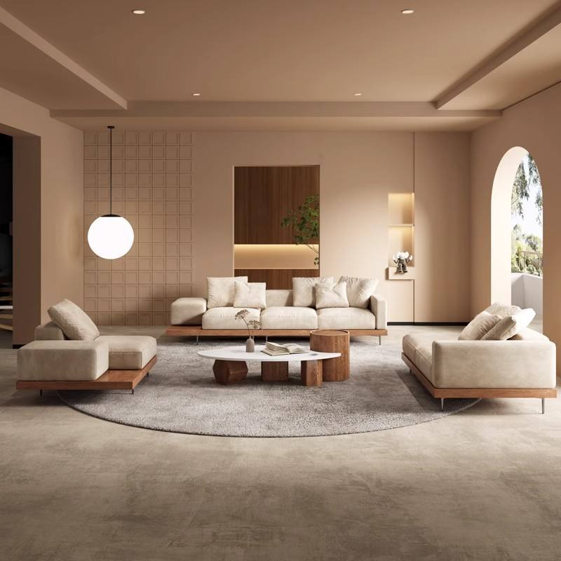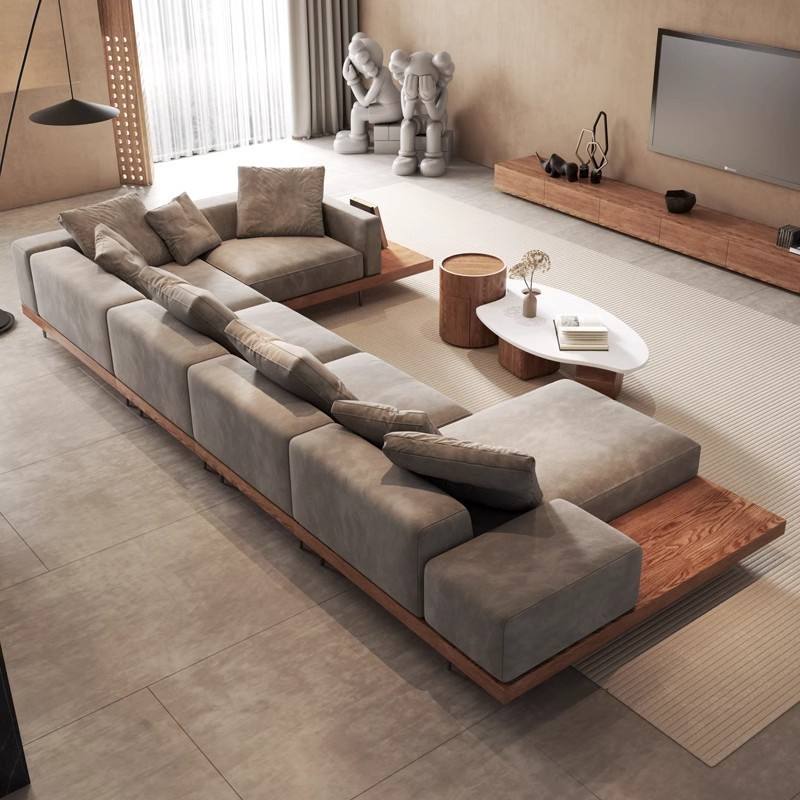Sofá modular en forma de L con estructura de madera maciza, tela beige y relleno de espuma para la decoración del salón del hogar.