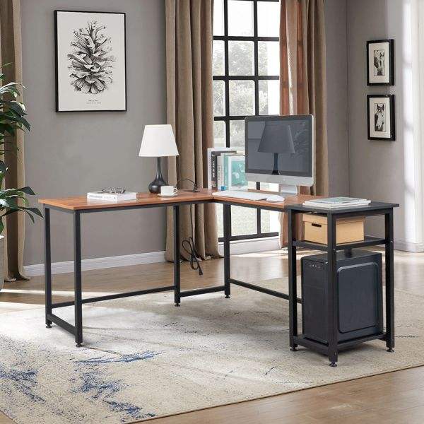 Escritorio para Computadora en Forma de L de Madera Tiger con Tomas de Corriente y Estante