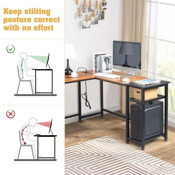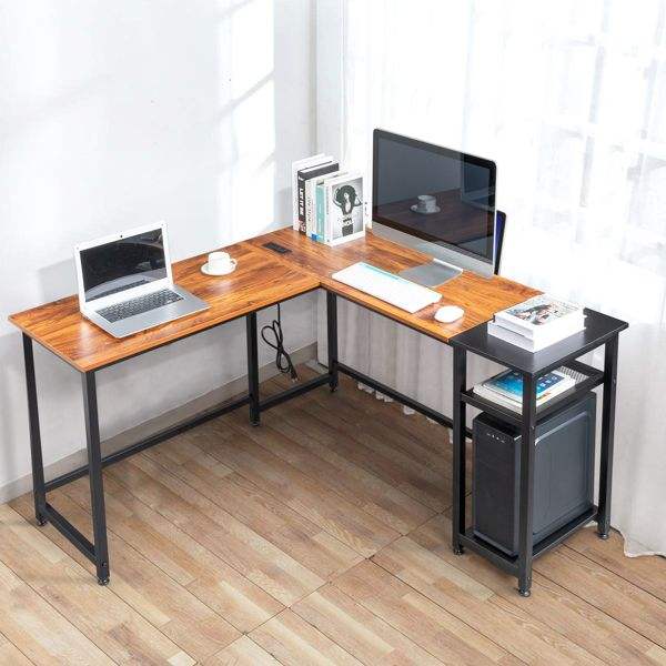 Escritorio para Computadora en Forma de L de Madera Tiger con Tomas de Corriente y Estante