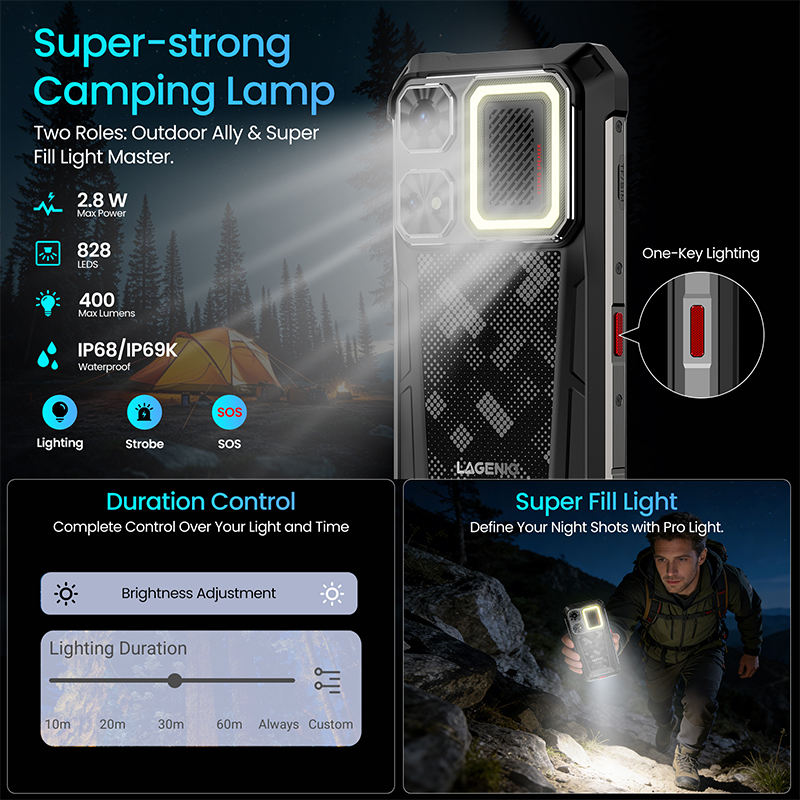 Teléfono Resistente LAGENIO Rhino1 Pro con Sonido Estéreo Unisoc T7250, ESIM, 12000 mAh, 8+ 256GB, Smartphone a Prueba de Agua, Polvo y Golpes para Viajes y Fiestas