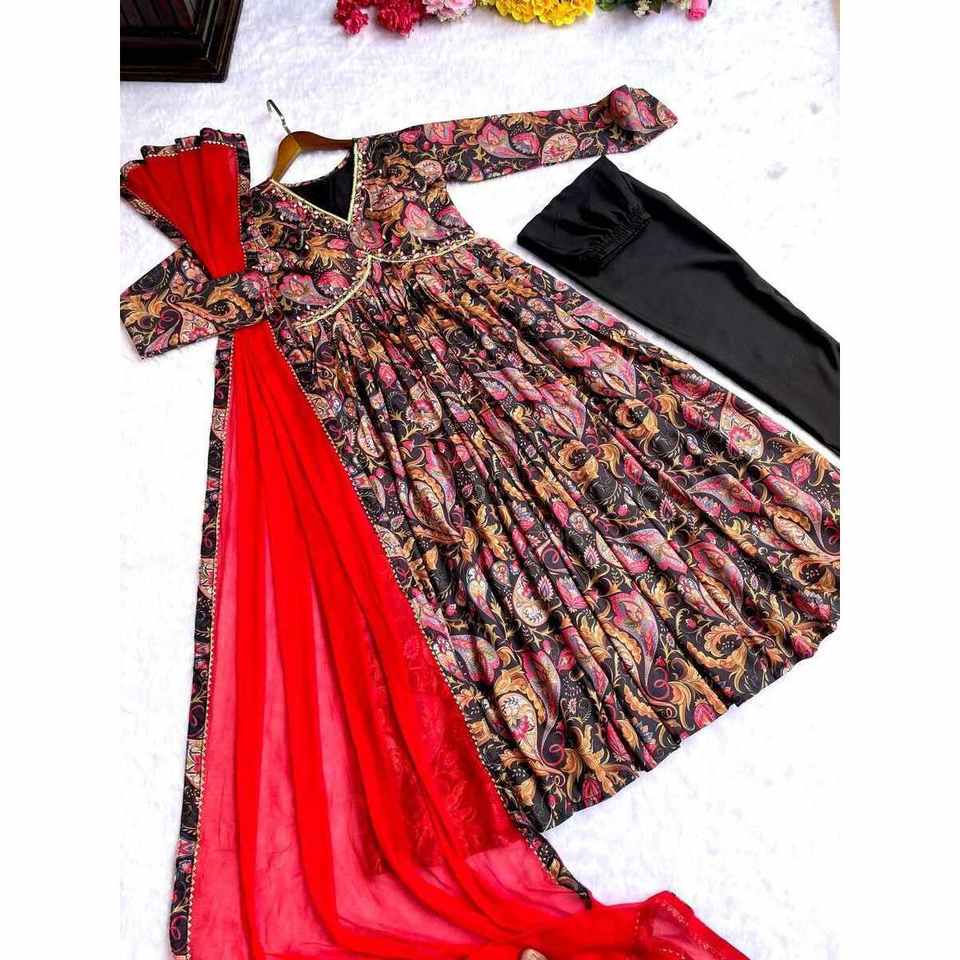 ÚLTIMO ALGODÓN IMPRESIÓN DIGITAL TRABAJO ALIA CUT KURTI BOTTOM CON DUPATTA NEGRO