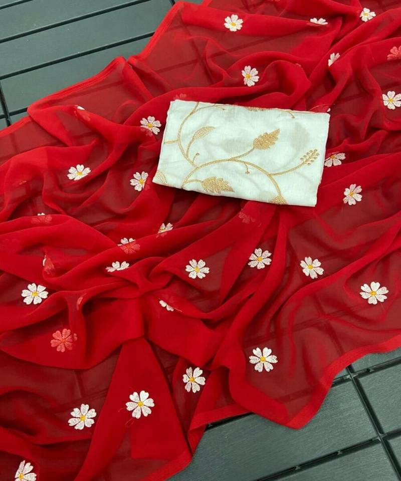 ÚLTIMO BORDADO DE HILO GEORGETTE TRABAJO SAREE CON BLUSA SIN COSTAR ROPA DE BODA PRECIO AL POR MAYOR ROJA ÉTNICA