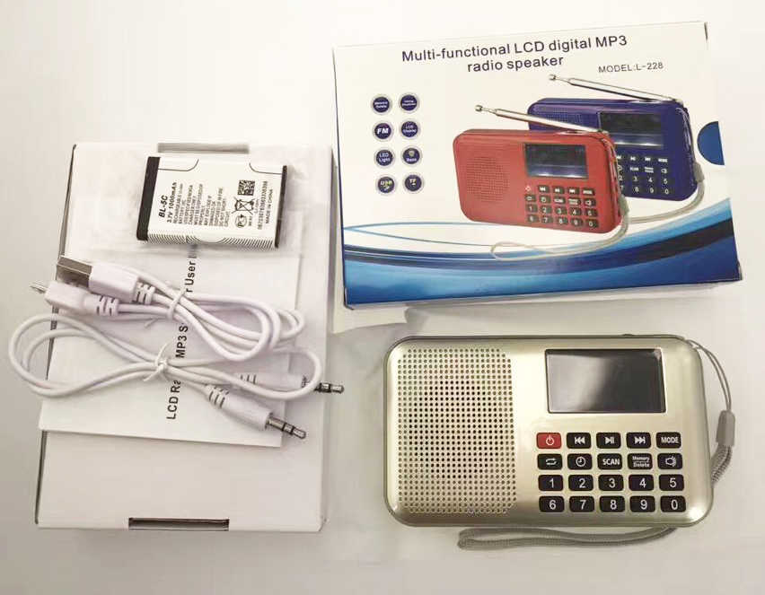 Packing include: 1*L-228 radio speaker, 1*rechargeable battery, 1*USB charging cable, 1 audio cable, 1 colorful gift box/pc, 60 pcs/ctn, carton size: 34*31.5*33.5cm,