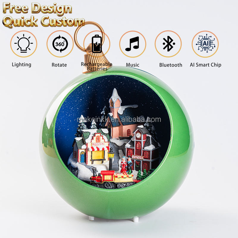 Caja Musical con Bola Iluminada LED, Adorno Navideño de Resina Personalizable con Escena de Pueblo, Tren/Tienda, Decoración Festiva para Mesa