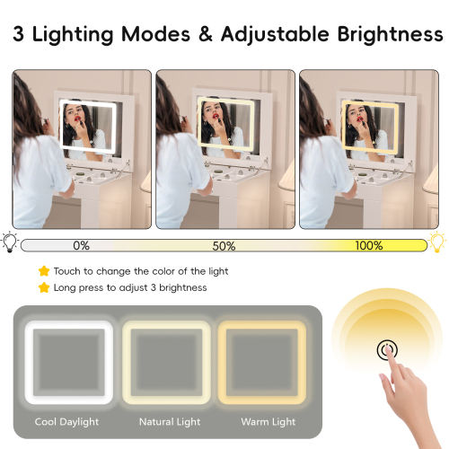 Tocador con Espejo LED e Iluminación, con Compartimentos Plegables Abatibles, Estantes Ajustables y Tapa de Cristal para Dormitorio