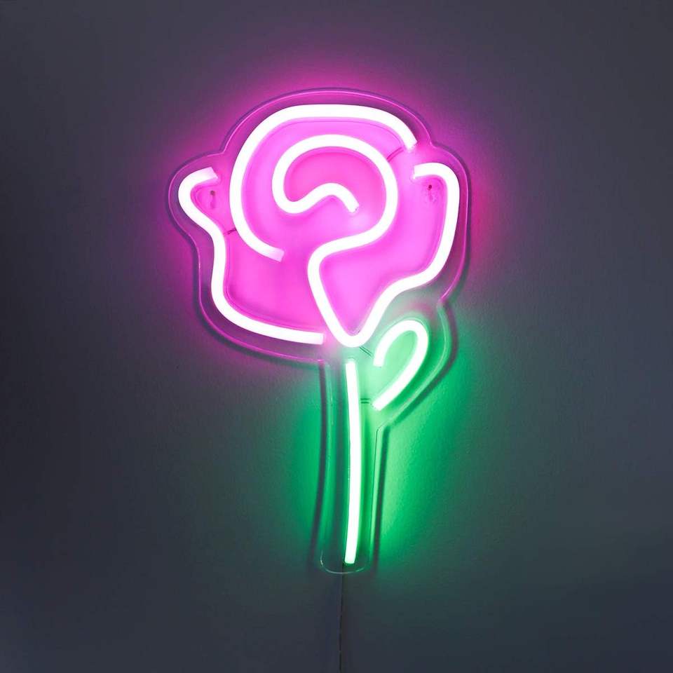 Letrero LED de Neón con Forma de Rosa Rosa de 15" x 9" con Tallo Verde para Decoración de Pared en Dormitorios y Fiestas
